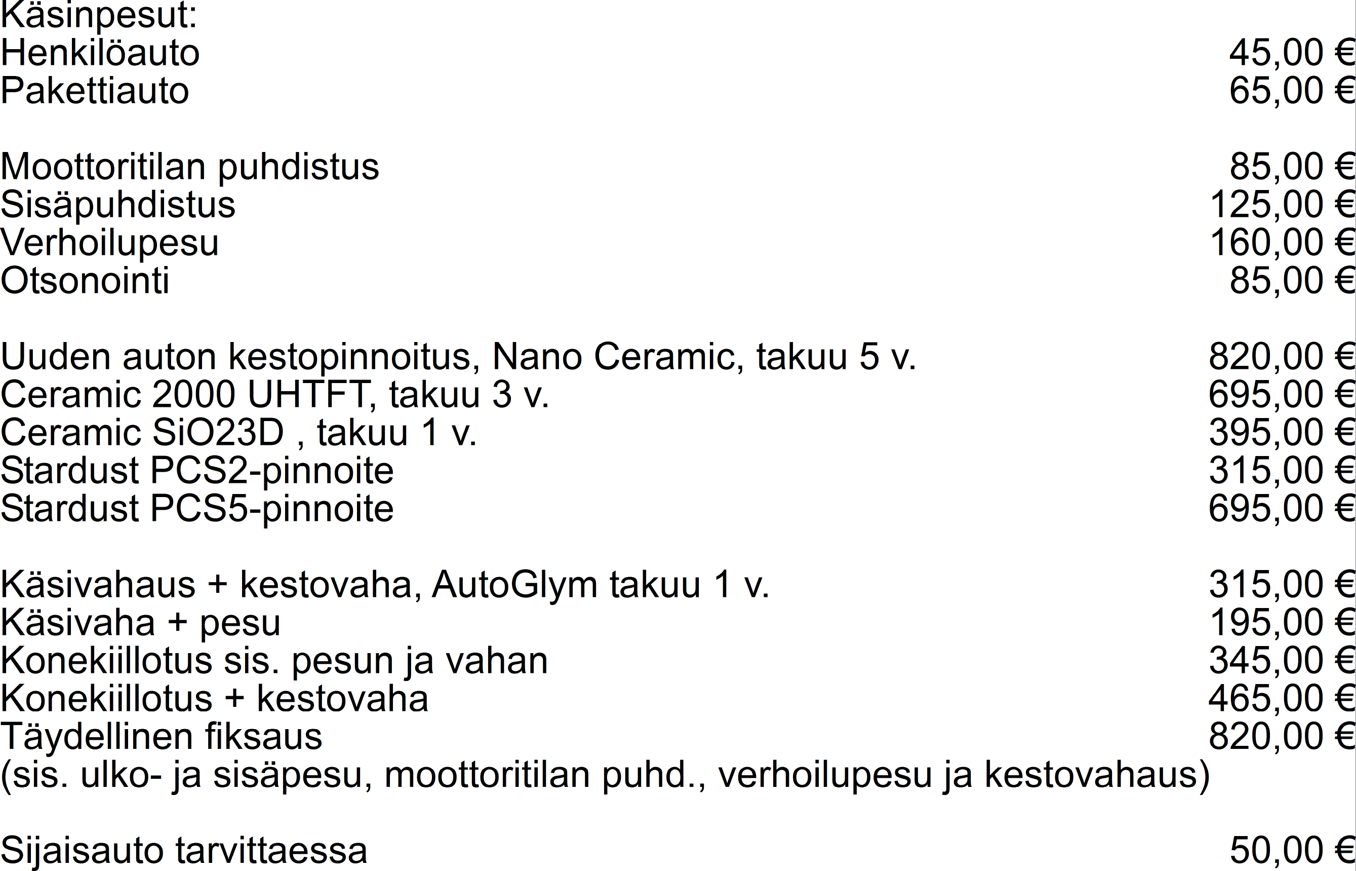 Hinnat sisältävät Alv 25,5% ja ovat voimassa 1.9.2024 alkaen.